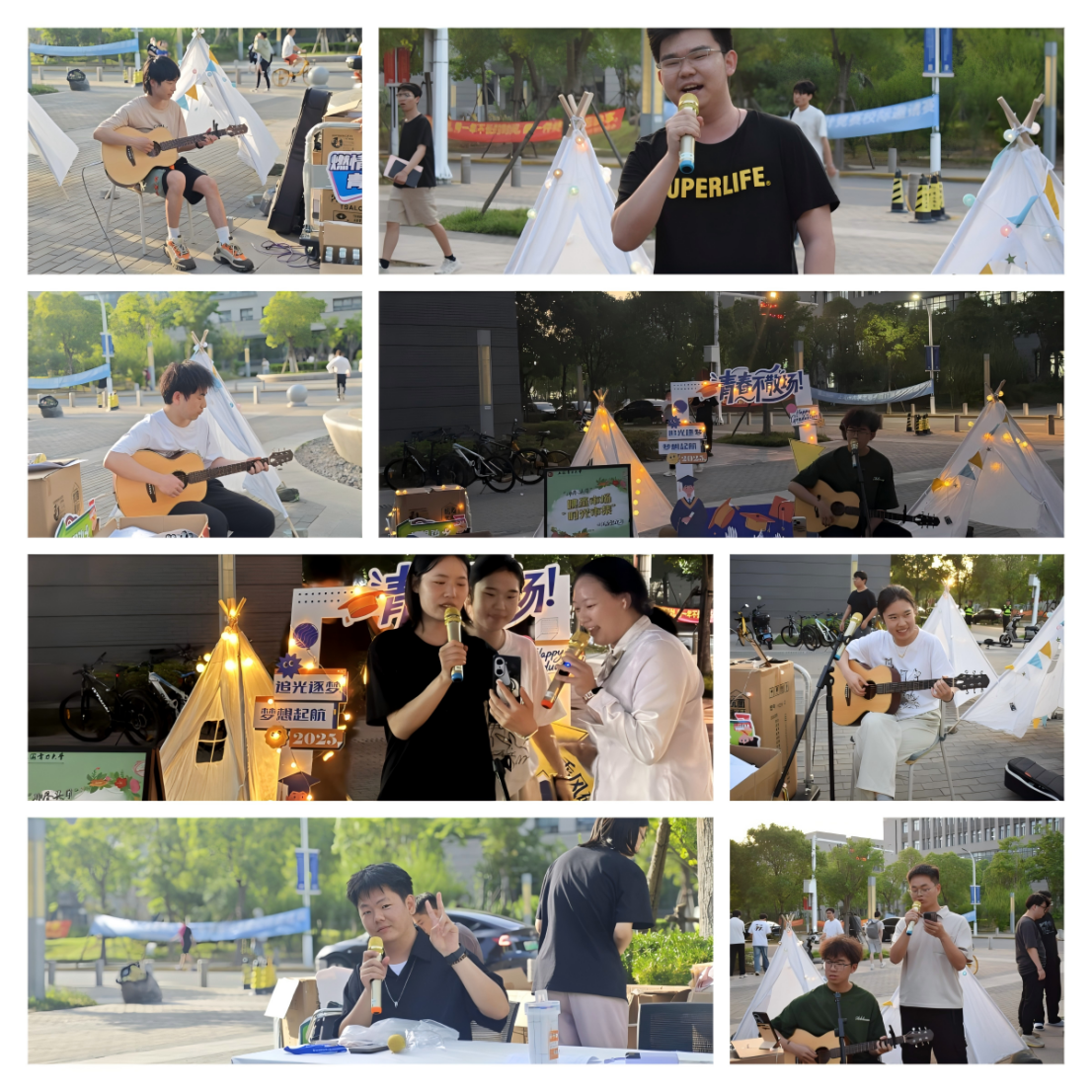 活动现场特别设置露天驻唱舞台,邀请毕业班员工张茂、张础岩、张亮及院十佳歌手张祉言倾情献唱。《一路向北》《凤凰花开的路口》《同桌的你》《那些年》《入海》等经典校园歌曲引发全场共鸣,摊位暖黄的串灯与往来人影交织成画,婉转歌声中,有人低声跟唱,有人举灯轻晃,点点光影摇曳如星河倾泻。更有即兴加入的“观众点歌”环节,泰国留学四姐妹以一首《Body Shaming》唱出“打破偏见,拥抱自我”的宣言,掀起一场关于自信与勇气的声浪,将夏夜的热烈氛围推向高潮。