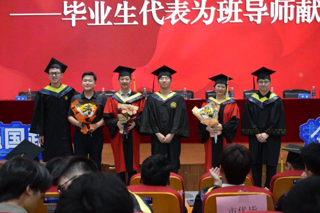 在温暖与关怀下,毕业生代表上台为班导师和辅导员代表献上鲜花,鲜花寄意,表达最深的敬意与谢意。
