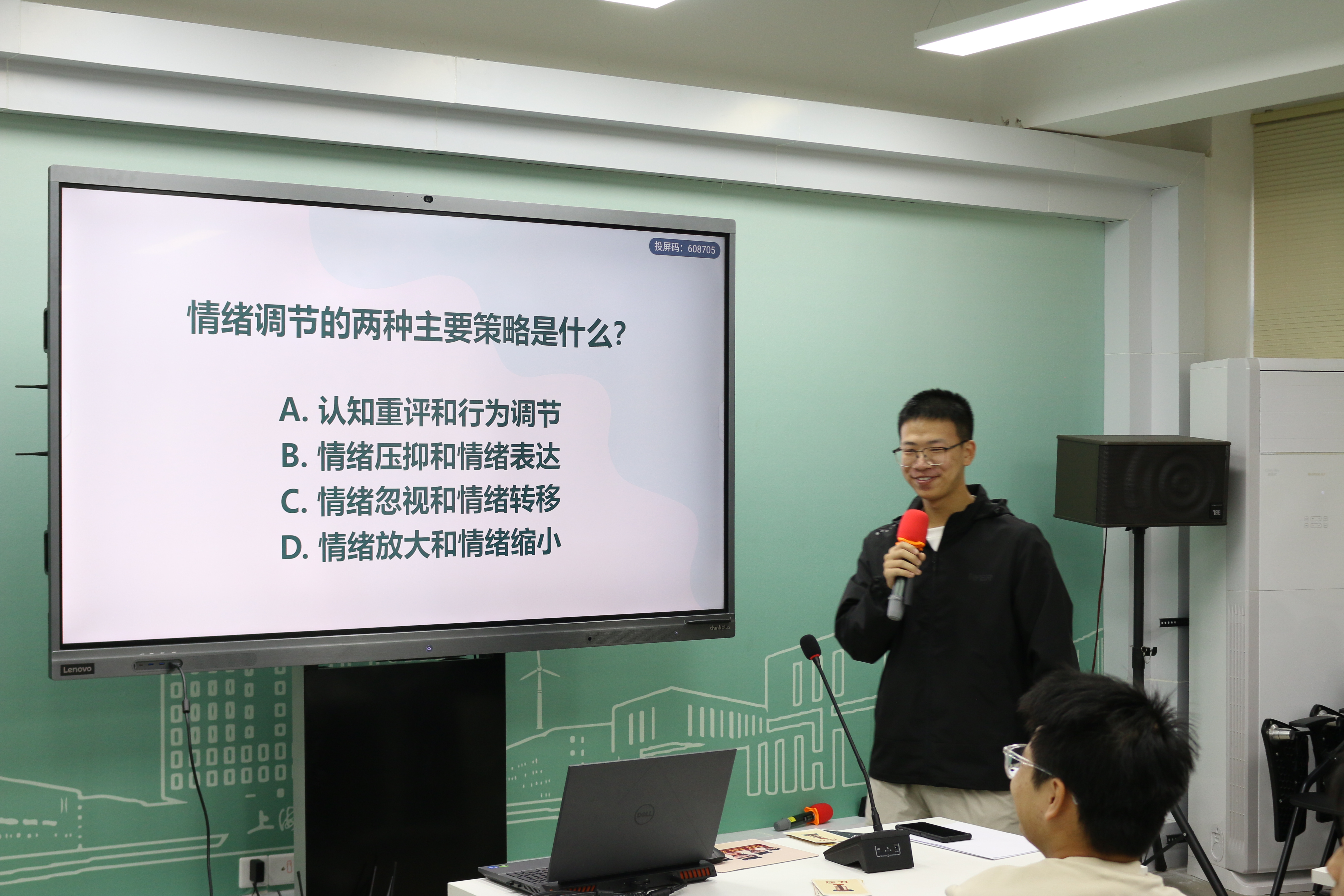 “能量感知”环节由小组成员通过丰富的肢体语言和情境模拟,生动演绎所抽到情绪能量的状态,由其他组员猜测。这种沉浸式的体验,让同学们不仅理解了情绪的概念,更用身体感知了情绪的“能量”属性,现场气氛活跃,笑声不断。