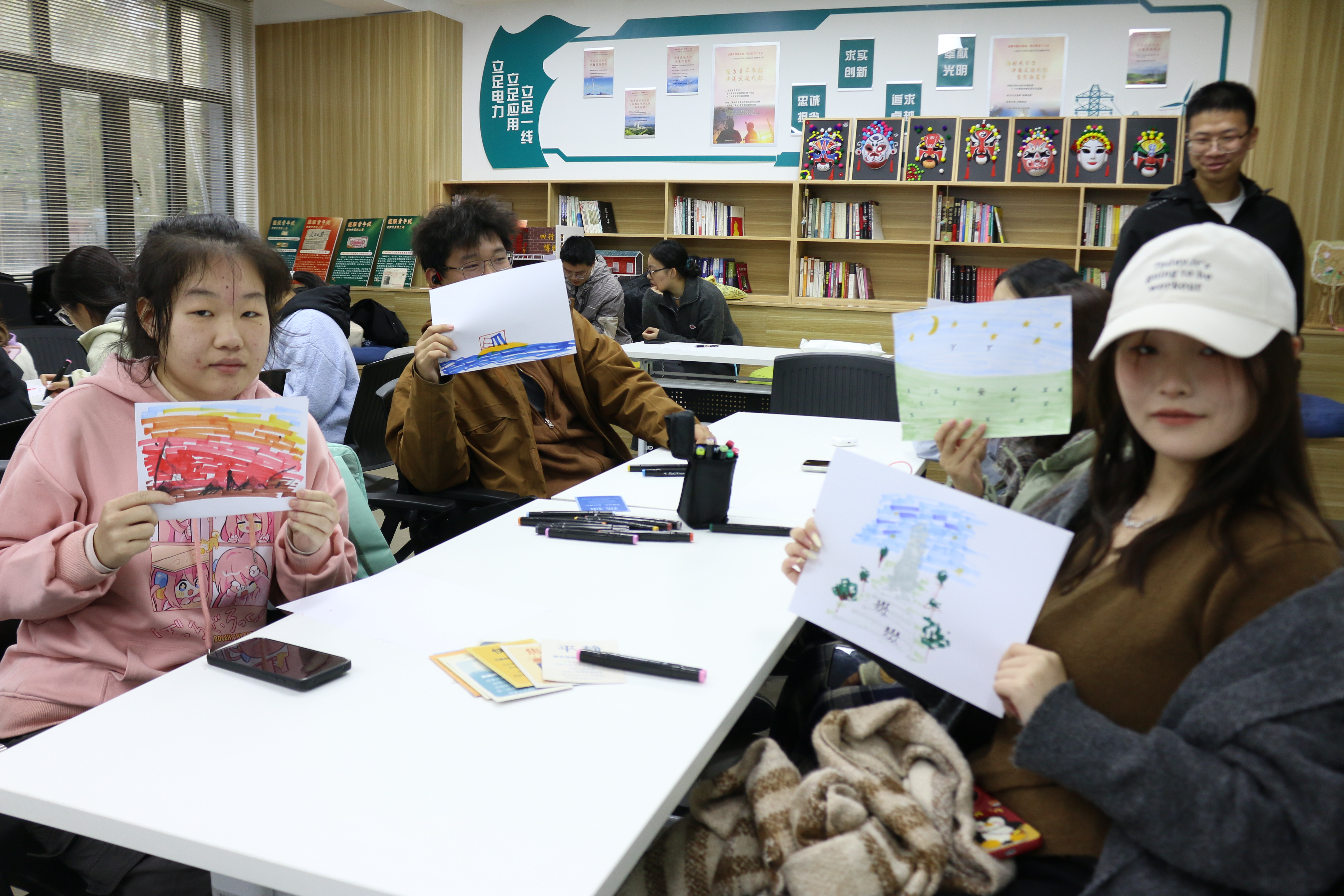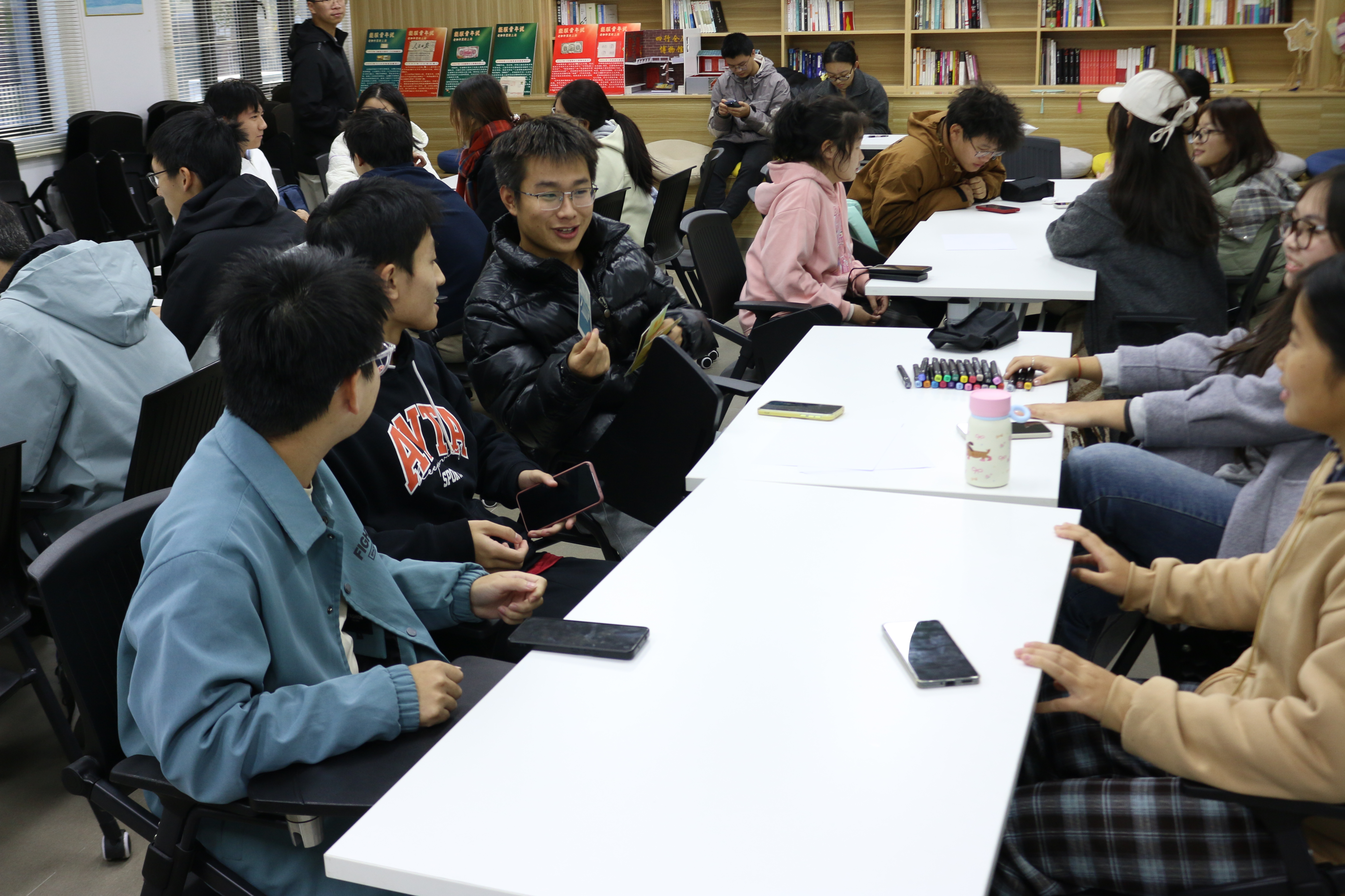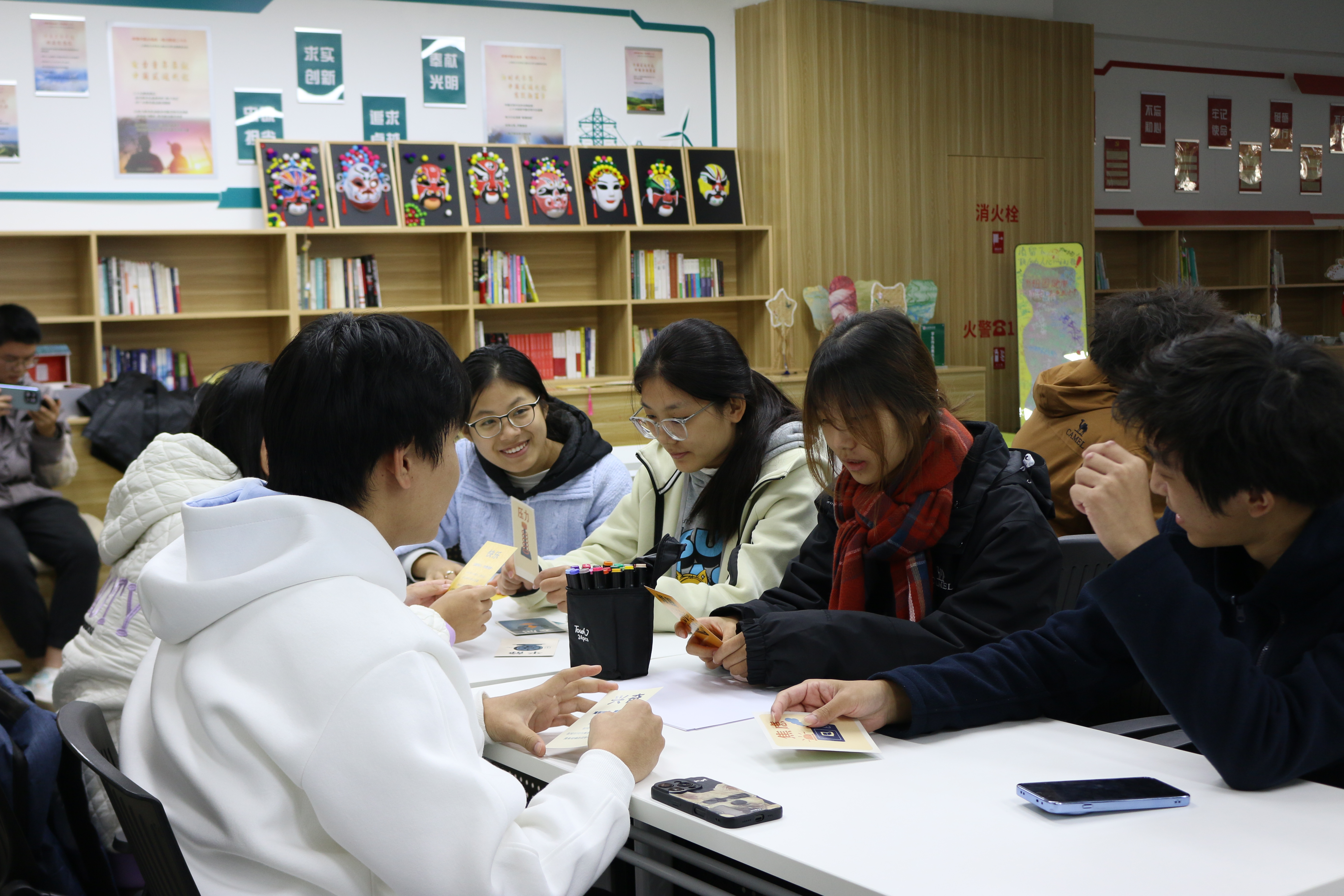 活动伊始,舒缓的音乐下同学们逐渐放松自己,桌椅被布置成多个“能量基站”,桌上预先摆放的“情绪能量卡牌”迅速吸引了大家的注意,为即将开始的活动营造出浓厚的创意与探索氛围。