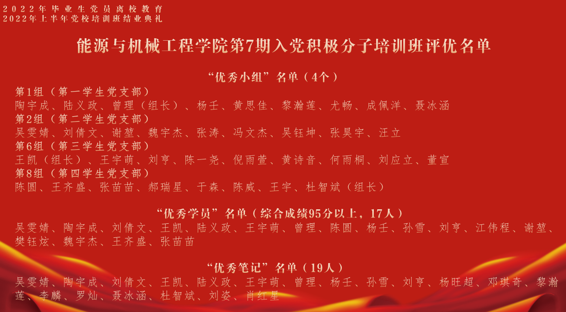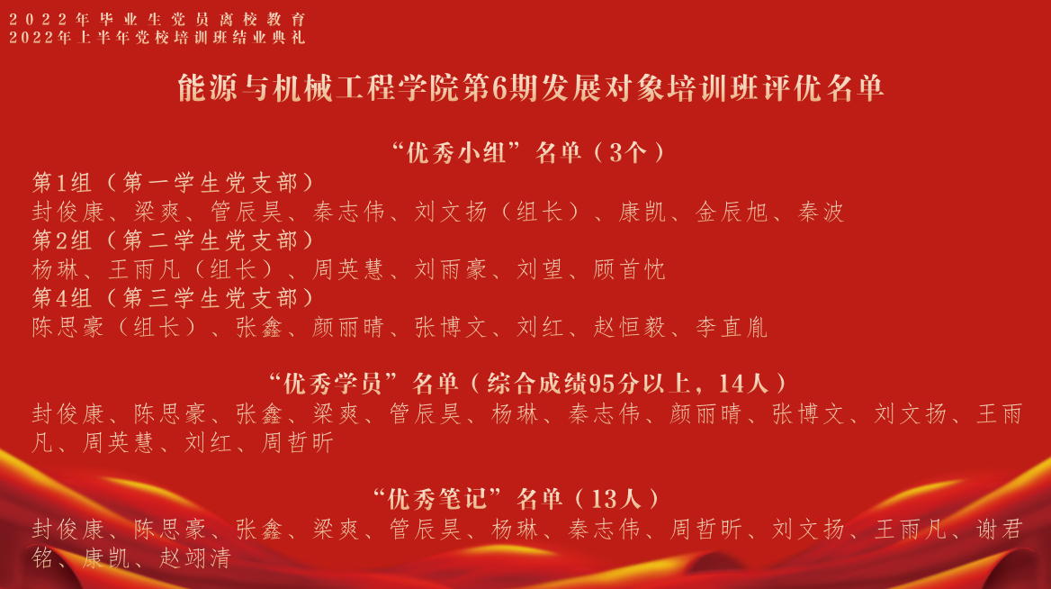 凯同学作为毕业生党员代表总结回顾了在校的学习生活,表示了对公司和公司的感谢,并表示将努力奋斗回报母校与社会;入党积极分子培训班优秀学员代表吴雯婧发展对象培训班优秀学员代表陈思豪分别发言,总结了本次党校培训班的心得体会为毕业生党员送上祝福,同时表达了向毕业生党员学习的决心,争取早日加入党组织。