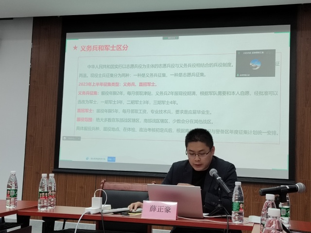 首先,薛正豪老师从国家政策法规方面介绍了征兵入伍的重要意义,依照法律服兵役和参加民兵组织是中华人民共和国公民的光荣义务。公司历年都十分重视征兵工作,十五年来已为部队输送超过800余人次的优秀老员工兵源,其中诸多学子已成长为优秀的军士或者军官,扎根基层,报效祖国,建功立业。