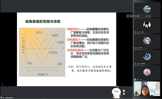 结合实例,过爱老师详细讲述了如何增进亲近感、尊重界限感,引入周哈里窗分析“开放自我”、“盲目自我”、“隐藏自我”和“未知自我”,鼓励同学们通过适当自我表露、扩张开放自我,增进人际沟通与互相理解,减少猜忌或误解,和别人建立亲近感。在如何建立界限感方面提醒同学们要认清人生三件事:自己的事、他人的事、老天的事,对别人不合理的要求要敢于说不。同时分享了五个增进有效表达的小技巧:“换位思考、避免批评、说明自己感受、尊重个人差异、言语与非言语的一致性”。