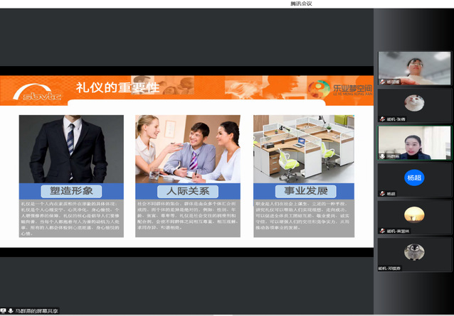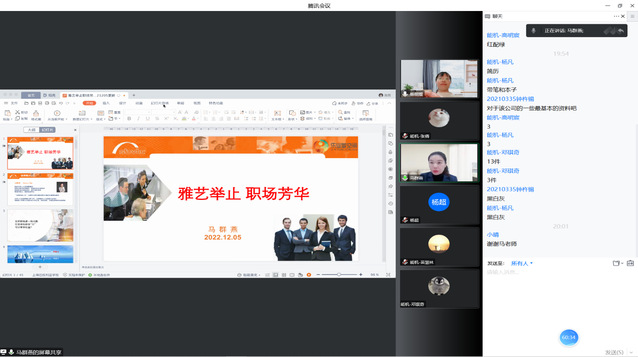 为加强同学们就业技能技巧,提高就业竞争力,为步入职场、步入社会打下良好基础,BETVICTOR于2022年12月5日晚19:00在线上开展了主题为“专家同行 聚力暖冬—雅艺举止、职场芳华”的职场礼仪培训讲座。本次讲座邀请了高级人力资源管理师马群燕作为主讲人,为同学们悉心讲解了礼仪与习惯,气质和仪态,会面与商务,沟通与谈吐。