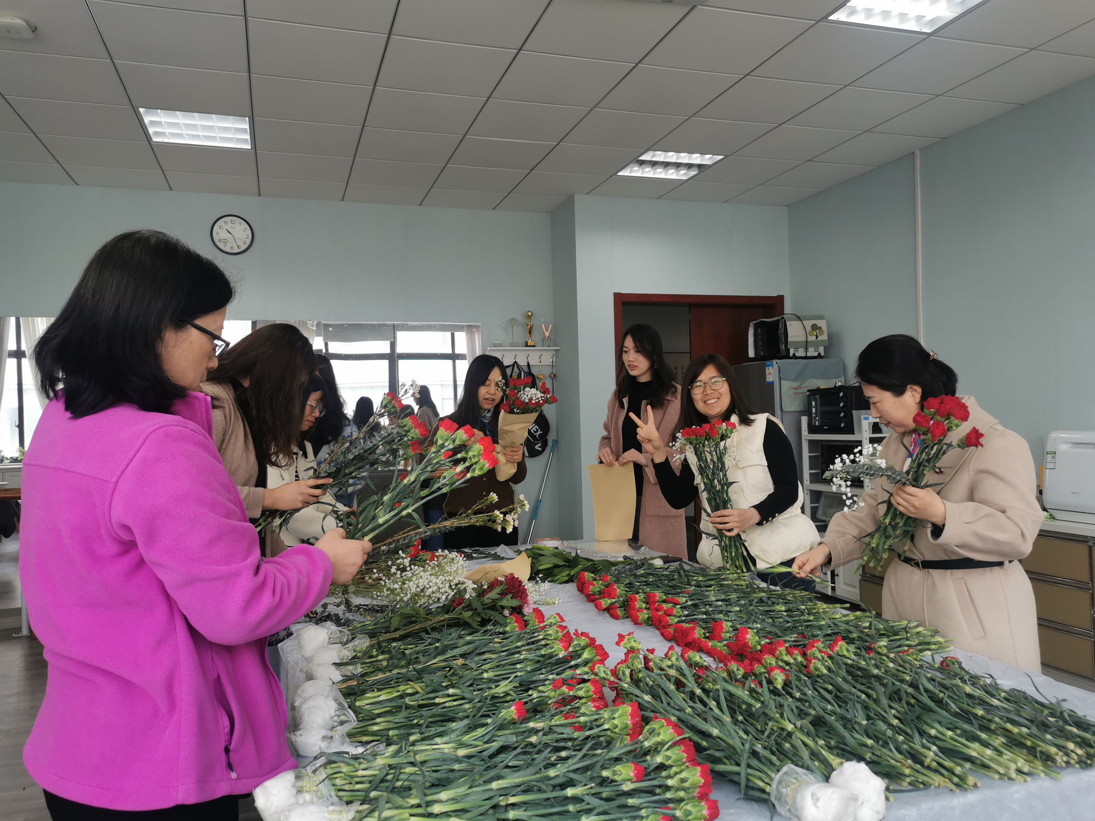 女教职工们用自己灵巧的双手,尽情发挥创造力,修剪枝叶、搭配色彩,忙得不亦乐乎,在自我创作、欣赏中尽显慧智兰心。在大家的巧手下,玫瑰花、洋牡丹、康乃馨、太阳花等各种花和绿叶搭配组合在一起,变成了一束束令人赏心悦目的艺术品,有的诗情画意,有的高雅格调,有的清新怡人。老师们将精致、新意融入了每一个细节中,她们笑靥如花,芳华自在,纷纷为彼此送去深深的祝福。