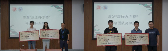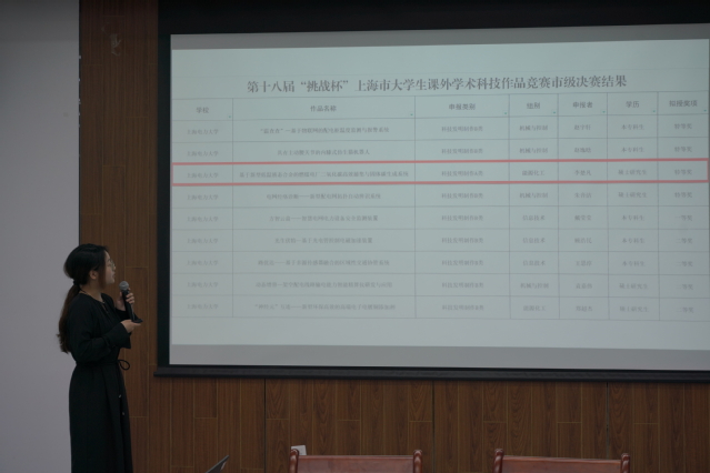 成勇宣读2022年度获“康迪纳-东楼奖学金”支持的科创项目团队名单,并与于磊先生一起为获奖团队代表颁奖。荣获第十八届“挑战杯”上海市老员工课外学术科技作品竞赛特等奖的科创项目团队进行了现场展示分享,为同学们树立了热爱科创、投身科创的榜样。
