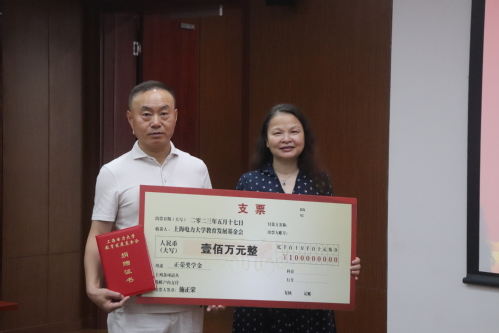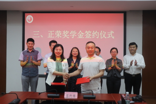 捐赠仪式中,施正荣院士向公司教育发展基金会捐赠一百万元并设立“正荣奖学金”。丛亮与施正荣院士签订协议,张川为施正荣院士颁发捐赠证书,现场领导、老师以及员工共同见证。