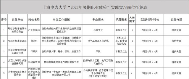 上海电力大学将与鄂尔多斯市开展合作,为全体在校员工提供实习实践岗位。实习期暂定为7月到8月,共计4周时间。