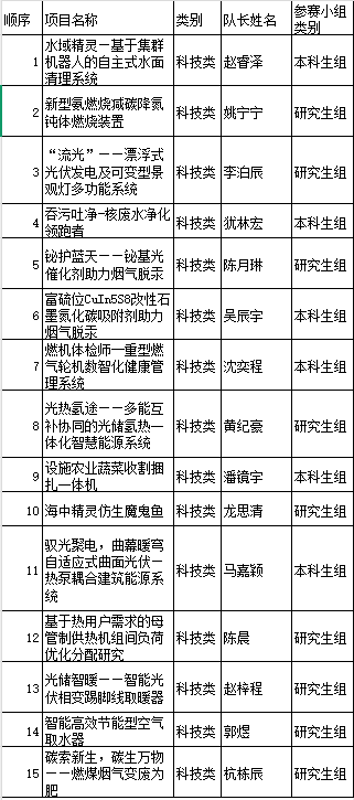 比赛共有来自本科生组和研究生组的17支队伍同台竞技,展现创新成果。参赛项目紧扣“节能减排、绿色低碳”主题,涵盖核废水净化、光伏储能耦合、氢能利用、智能环保设备等多个前沿领域。本科生组与研究生组各展所长,既有面向实际应用的“吞污吐净-核废水净化领跑者”、“水域精灵—自主式水面清理系统”等实践型项目,也不乏“光热氢途—多能互补智慧能源系统”、“燃机体检师—燃气轮机数智化管理系统”等具备深度科研价值的技术方案。